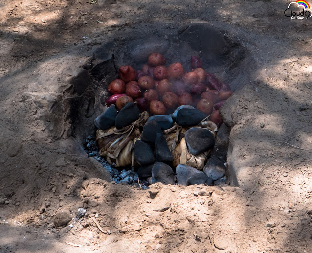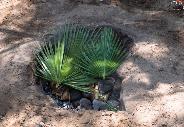 It involves heating up lots of large round stones in a fire then placing them in a pit in the ground. On top of this you load on your meat and vegetables then cover the whole area with large leaves and earth.
