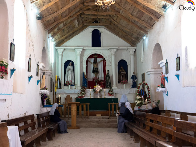 Our next pit stop was in the very pretty riverside town of Chiu Chiu. Pat and I manged to have a nice walk around the town and get to see inside its beautiful small church. Although not religious it was quite moving to see several nuns in the church praying. One had a guitar and was singing like a bird. Sadly the bird in mind would have been a crow .