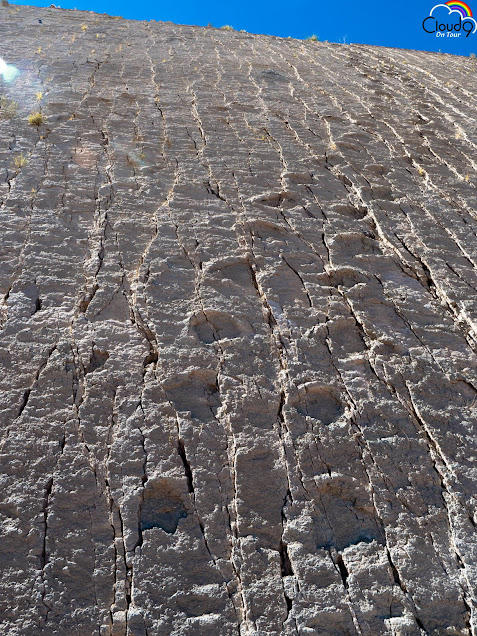 No seriously. This rock face was once horizontal . The tracks set hard in the mud, which over millions of years turned to stone and the whole area was pushed up to the near vertical plane by sedimentary heave, that is still ongoing today.